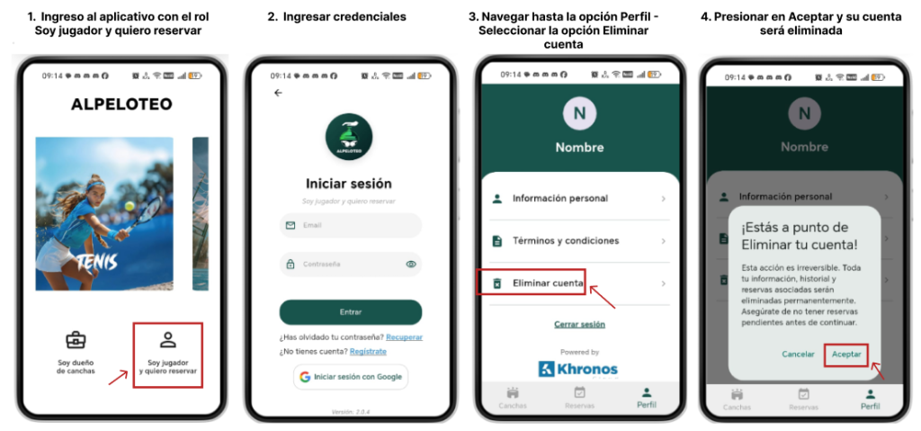 Proceso para eliminación de cuenta Alpeloteo-Soy jugador y quiero reservar